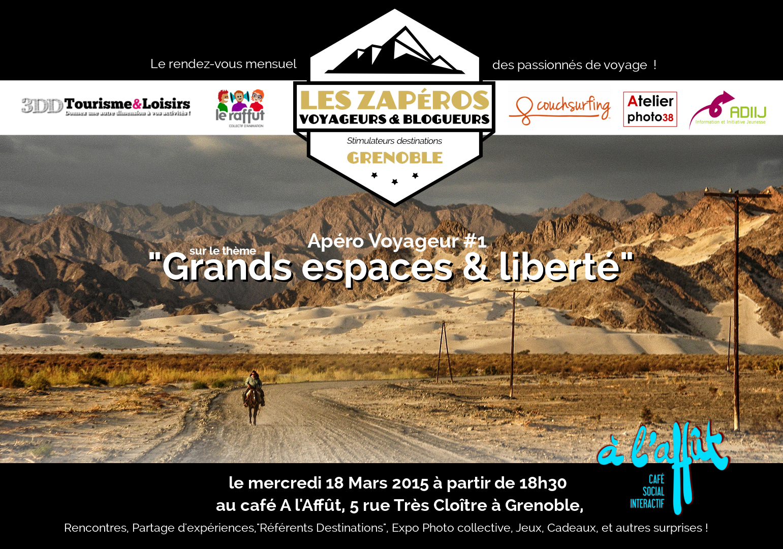 Merci à Gil qui est à l’initiative de ce projet et qui travaille dur pour vous offrir une très belle première soirée spéciale Zapéros Voyageurs ! Les co-organisateurs principaux de ce projet sont : 3DD Tourisme&Loisirs / Association Le Raffut / Couchsurfing.