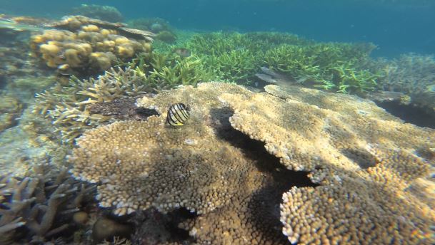 Nous profitons la première après midi de la belle plage de sable blanc, et réalisons notre première initiation plongée, avec masque et tuba. Après quelques brasses, nous découvrons de très beaux coraux, et de belles étoiles de mer. Nous nageons avec de jolis poissons.