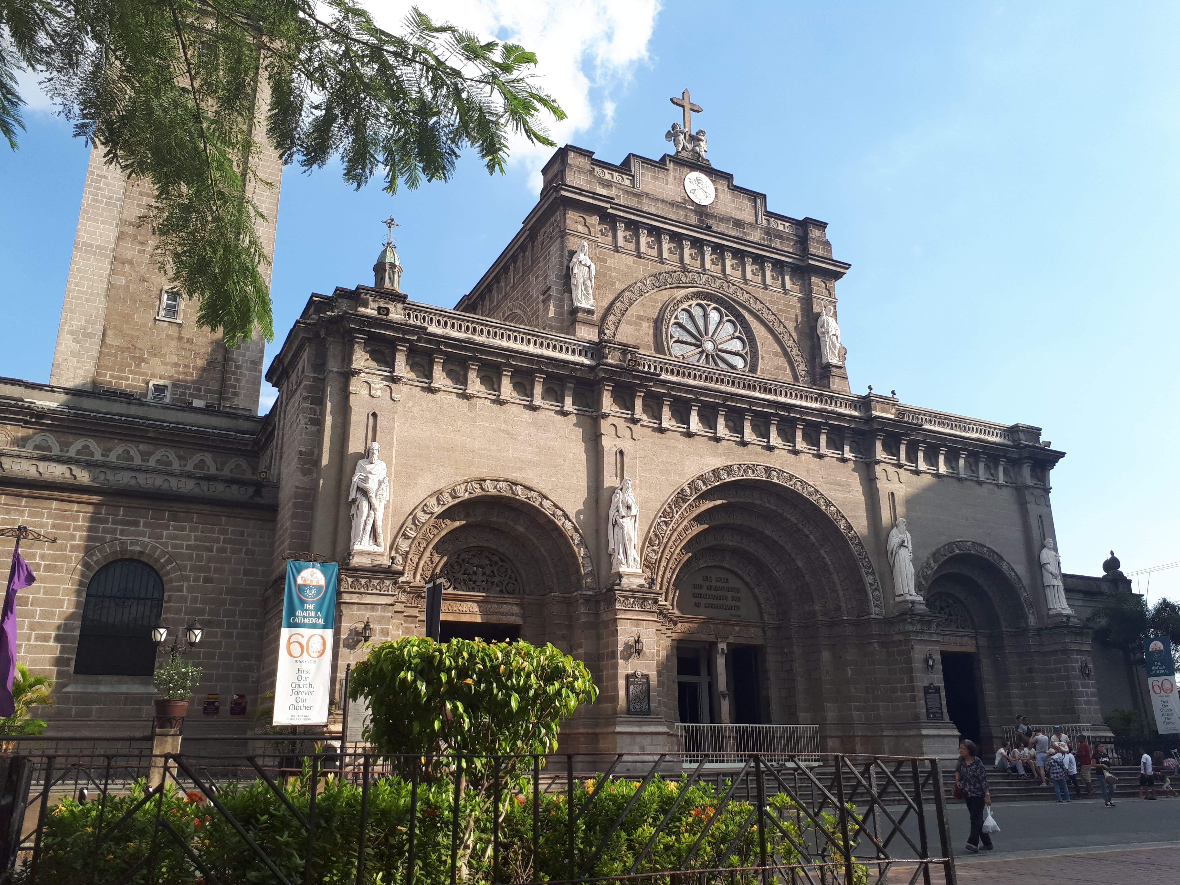 Nous découvrons notamment la place centrale qui donne sur la cathédrale de Manille. Nous y jetons un œil (entrée gratuite lors de la messe vers 11 heures). C’est l’un des monuments emblématiques de la ville.