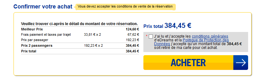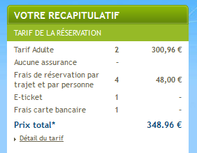 Je dois aussi commencer la réservation, puis je découvre ensuite que la somme de 48€ s’est ajoutée au total de la commande pour « Frais de réservation par trajet et par personne ».