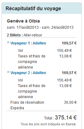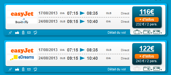 Je cherche un vol Genève / Olbia pour deux personnes du 17 au 24 aout, sans possibilité de décaler les dates de mon voyage.