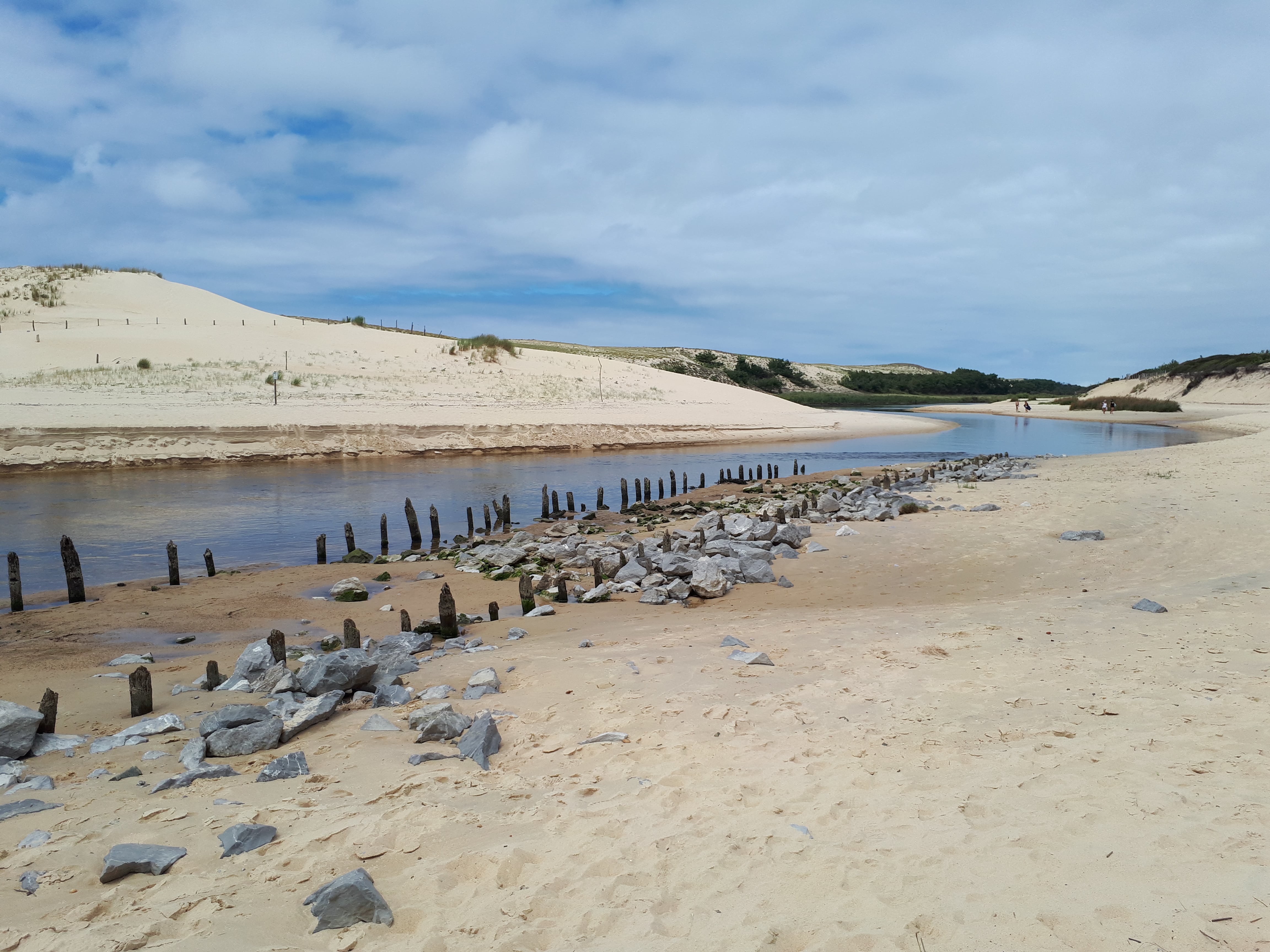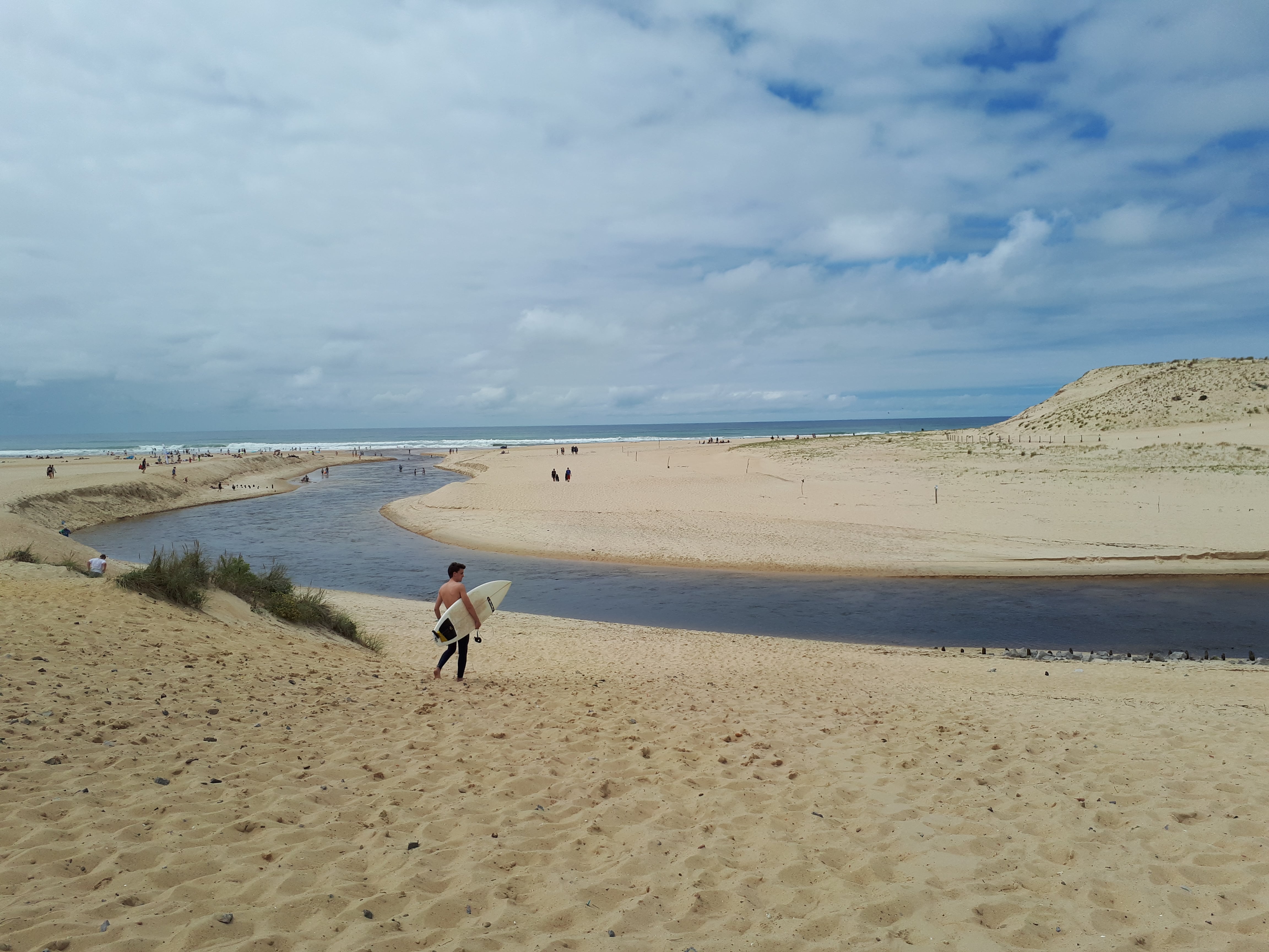 Nous terminons par emprunter de jolies petites routes entourées de pins, puis nous arrivons à Moliets-et-Maa, destination « choisie » au hasard ! Nous marchons, à côté des nombreux surfeurs, jusqu’à rejoindre le courant d’Huchet. Cette réserve naturelle avait attiré mon attention parmi les images disponibles sur internet. Il s’agit de la dernière embouchure naturelle de la Côte Atlantique. Le paysage est bluffant.