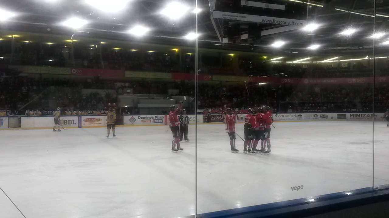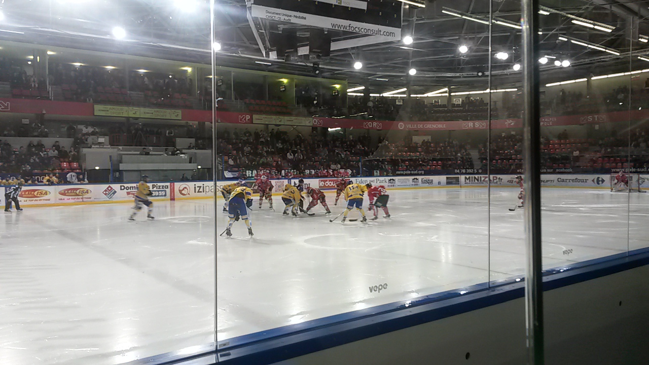J’ai assisté le 28 octobre 2014 au match de hockey sur glace, qui opposait Les Brûleurs de Loups de Grenoble aux Ducs de Dijon. Il s’agissait du 1/4 de finale de la Coupe de la Ligue. C’était un joli match, avec beaucoup d’actions, et 10 buts en totalité. Les deux équipes sont arrivées à égalité.