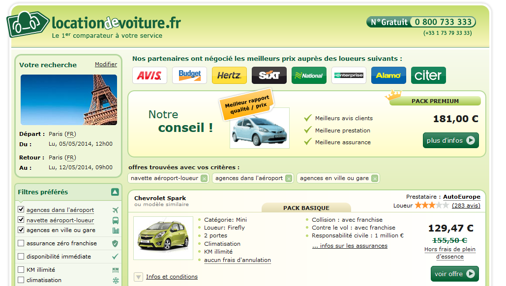Le comparateur locationdevoiture.fr permet de trouver le meilleur prix pour une location de voiture à Paris (et dans de nombreuses villes à travers plus de 100 pays). J’utilise souvent les sites de comparateurs de prix, que ce soit pour la location d’un véhicule ou d’un billet d’avion, car ces sites nous aident à trouver rapidement le prix le plus intéressant parmi l’offre variée des différentes compagnies. Et louer une voiture à Paris est une solution relativement peu couteuse. Par exemple, avec locationdevoiture.fr, le meilleur prix proposé pour la location d’un Chevrolet Spark durant 7 jours au mois de mai coûte seulement 129€ à ce jour.